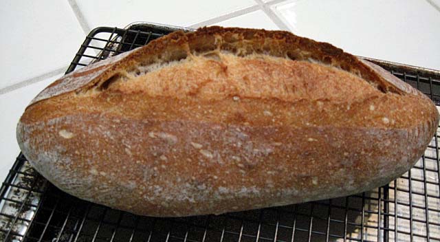 I also baked a couple loaves of one of the sourdoughs we made at the SFBI workshop. This one uses a firm levain fed at 12 hour intervals at 40% (by levain weight) of the final dough flour weight. After last week's trial of different methods of forming bâtards, I wanted to try the method portrayed in the KAF videos ( See Shaping) I think this method will become my method of choice.