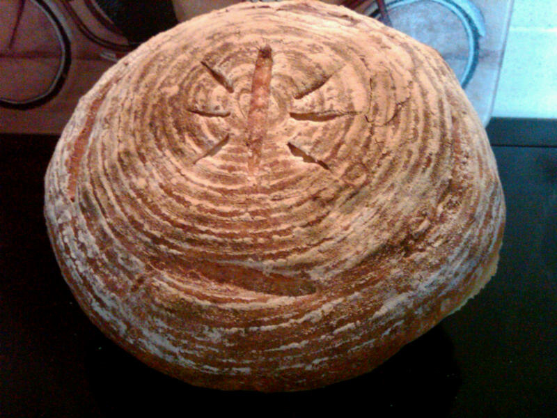 This was my very first attempt at Hamelman's Baguettes with Pate Fermentee and my pate fermentee looked rather dry ( I have never done this so was unsure) I let it set out over night it seemed dry in the morning but carried on anyways. Rather than making baguettes I shaped them into 2lb loaves but maybe should have scaled them to 1.5lb as the recipe called for on a side note. I was trying for a flower effect with my scoring but it looks like a spider. The taste is very very good but don't really think it turned out as it should have.  This is what I got: