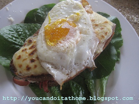 I used the recipe of Croque Madame from Gourmettraveller mag website. It was quite unsual that they put bechamel on top of the sandwich and grill under the broiler, instead of in the filling. The result is more appealing, I suppose.