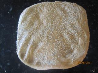 5.  Preheat & shape : Preheat the oven at 400F/200℃. Dump the dough in some sesami seads both sides and flatten the dough as much as you can. .                                                                                                                             2mm thick.