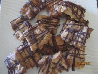 6. Place them on the rack to cool. When it is completely cool, put melted white chocolate in a ziplock and cut an edge like a triangle shape then drizzle it over the crackers.
