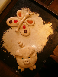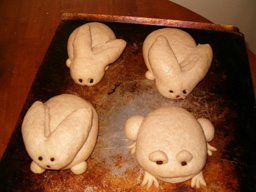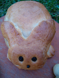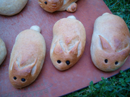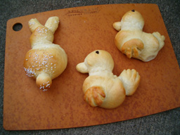 At this point I was using whole wheat dough.  I decided to try sweet roll dough for Easter bunny and chicks.  The dough raised so much after shaping that the designs were distorted.