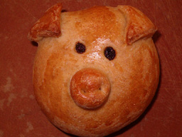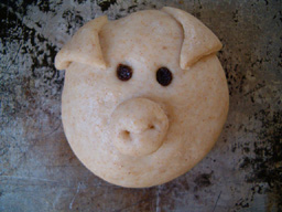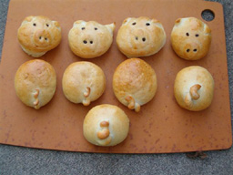 I then wanted a pig.  I thought it would be cute to serve pulled pork on a piggy bun.  Ironically, the pig proved to be the most difficult for me.  Even now I'm not confident the ears and nose will stay in place.  I tried to cut the ears in but couldn't secure the tips.  And then the nose . . . but for now I'll post pictures and talk how to's in a later post.  I did finally find a design I liked . . . but it's a rather difficult one.
