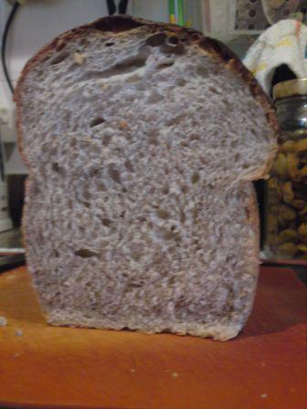 Very nice loaf, Ron. Especially I like the color of the crust!!!  Nice touch to use the wood pan!!   The crumb's color is very nice, too. I like the crumb structure.  You did a really good job, Ron!