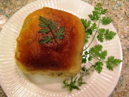 The chervil rolls were baked in a pan on a rack in the oven (no baking stone). The chervil didn’t brown at all and kept its green color through the bake :^)