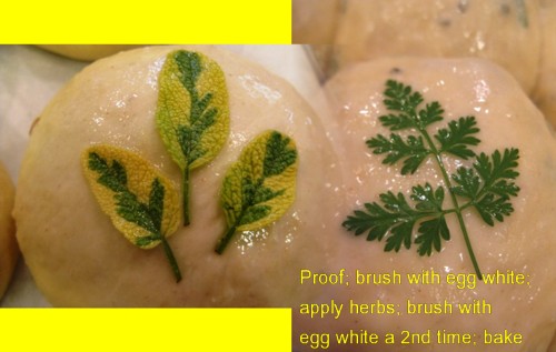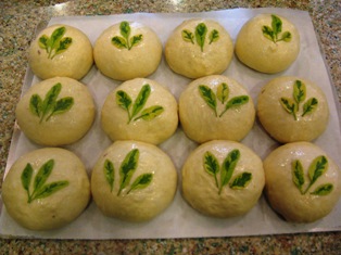 After proofing, the rolls are gently brushed with egg white; the herbs are applied; then the rolls are gently brushed with egg white again, making sure the whole herb leaf is covered; then the rolls are ready for the oven.