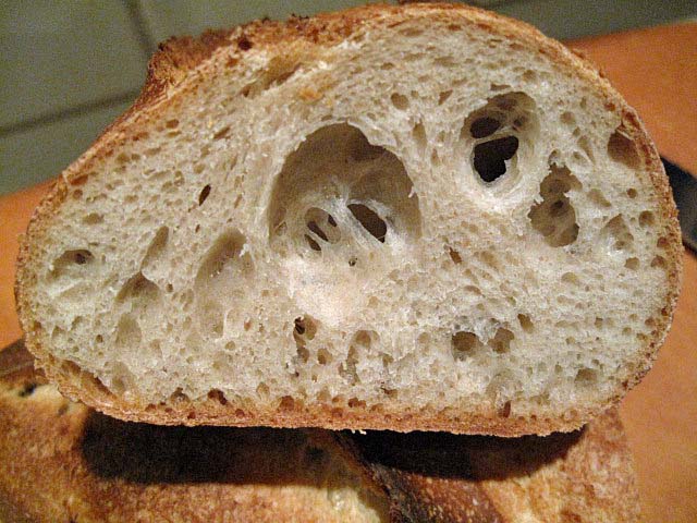 These two loaves were made with the same formula and the same method, both as prescribed by Hamelman in "Bread." The only difference is that, in example 2., I degassed the dough pieces more vigorously prior to pre-shaping. The result was a nice, classic sourdough bread crumb with a random distribution of different size holes. In example 1., you see distinct areas of denser crumb with several too large holes.