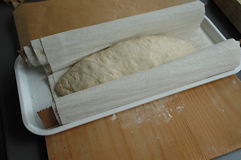 After shaping the loaves, transfer them to a linen couche, seam side up. Cover the loaves with a fold of the linen. Proof until the loaves have expanded to about 1-1/2 times their original size. (30-45 minutes) Test readiness for baking using “the poke test.” Do not over-proof, if you want good oven-spring and bloom!