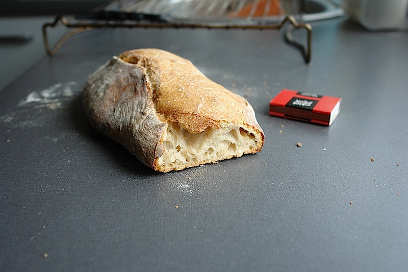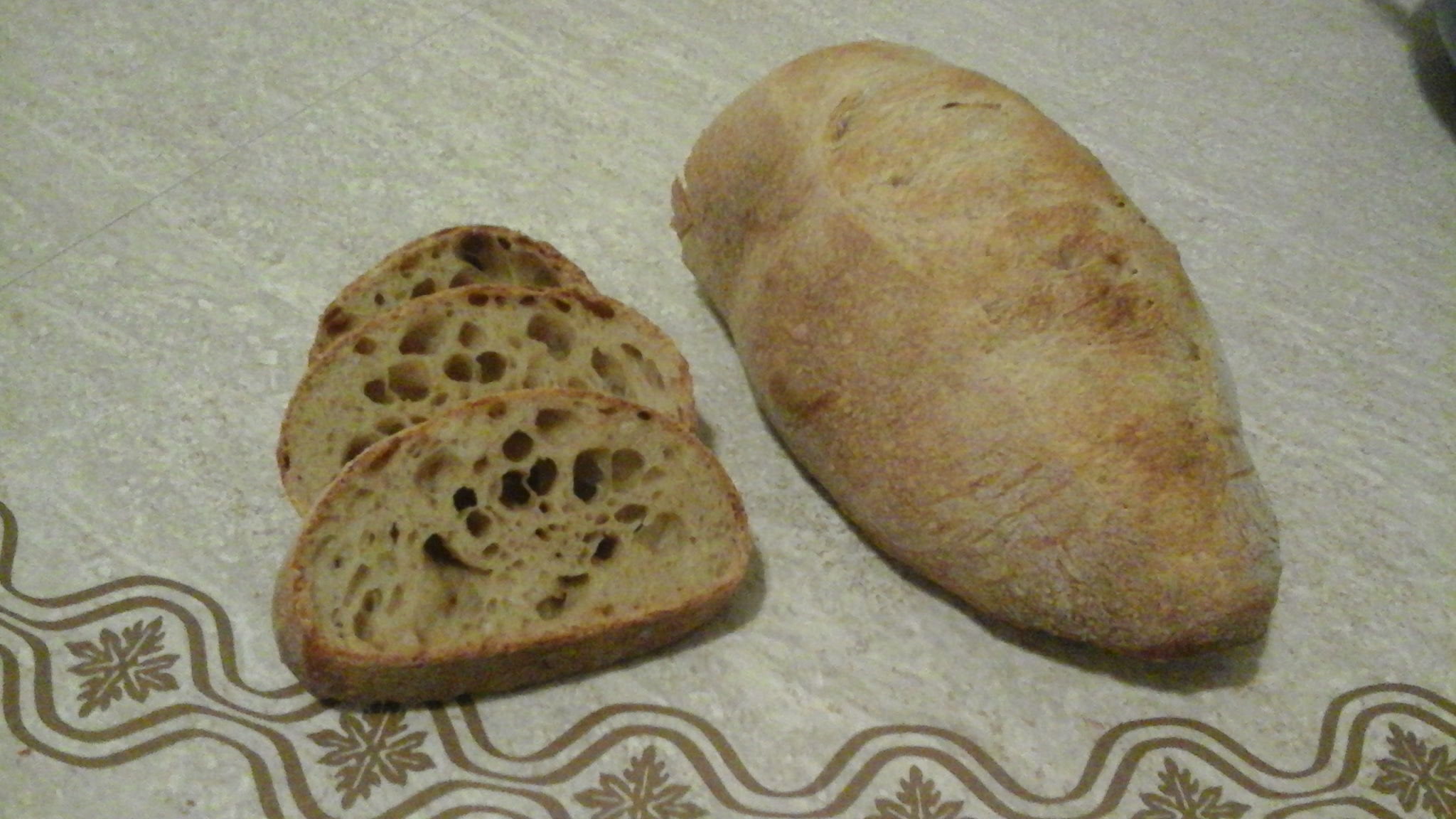 This technique results in excellent gluten development with the gluten strands cross-linked in a chaotic pattern, as opposed to the more regular pattern achieved with machine mixing. I do think this has a big impact on crumb structure. Of course, the high hydration level also contributes to the larger holes.