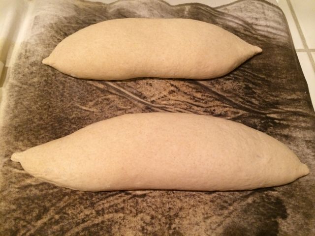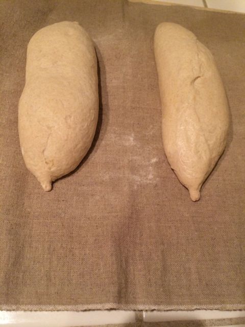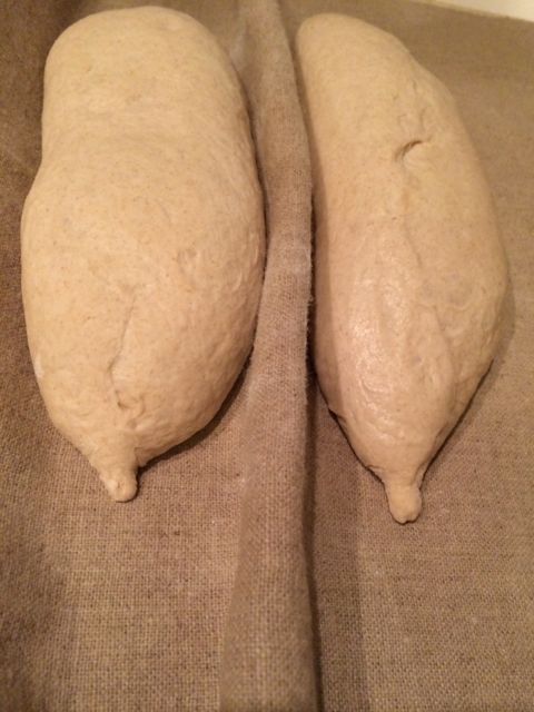 The loaves have been flipped over on the couche so the seam is down, flipped onto a transfer peel and then to the Super Peel for scoring and loading onto my baking stone. Again, note the nice high profile of the loaves.