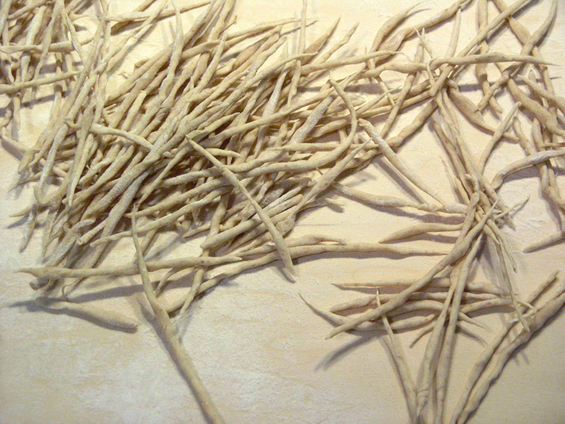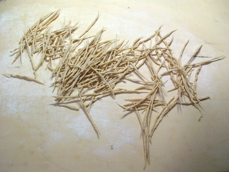 -Roll dough into rope about 3/8" diameter, cut off 3/8" long pieces. Roll them with your palm on an unfloured work surface until you get a piece of pasta that is about the length of the width your hand with both ends tapered. Place on a lightly floured wooden board to dry until you are ready to cook, or dry overnight. I have not figured out how to make them twist like the store-bought ones yet...