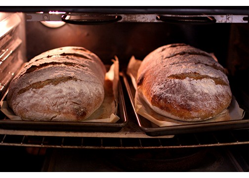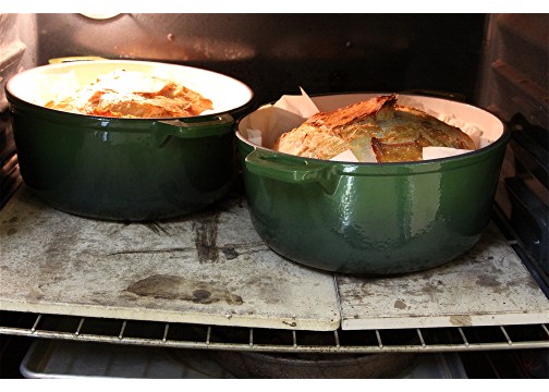 Also, I sometimes bake these size loaves on parchment in two large Dutch ovens (D.O.) which I place on a stone in the oven, side by side (lid on until the final 10 minutes of the baking cycle), turning the the D.O.s a half-turn midway through the baking cycle to even the browning of the loaves.  The D.O. is the way to go until you get confortable handling high-hydration dough.  You have to shape them round for the D.O.s.  The benefit to using the D.O is  the inside wall of the D.O. contains the spread of the dough which results in a higher rise and more open crumb (larger holes in the crumb).