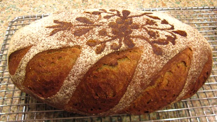 Thinking of Franko's travels, I was looking at pictures of folk art today and tried to paint a design on the bread reminiscent of eastern European folk art. (It's the thought that counts, right?! :^) I'm not a painter! and wish I'd been able to keep it more on center!).