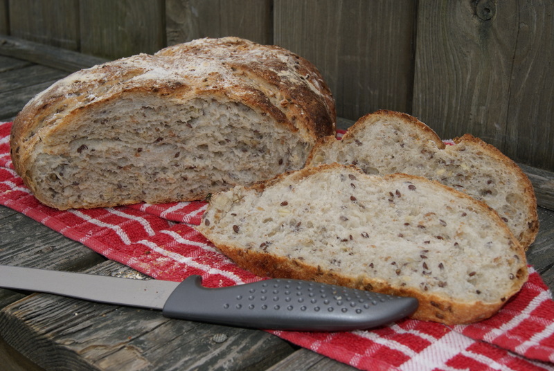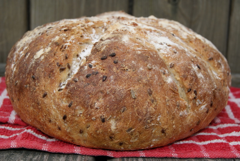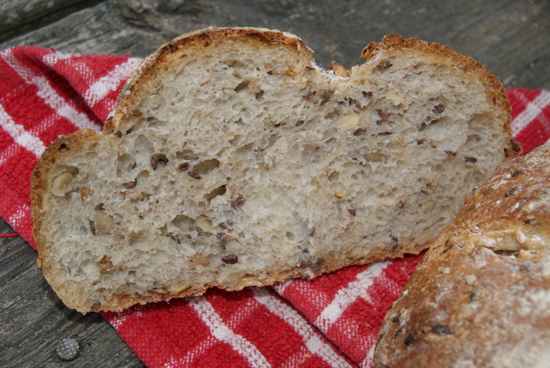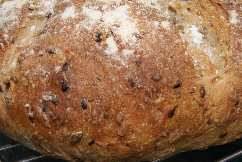 Wow. I loved the mouthfeel of every bite of this bread. It was made with soaker (rye chops, flaxseeds, sunflower seeds, and oats). I did adjust a water content a bit. The bread did not cool completely before we cut it for lunch. :) It was phenomenal. Next time I might try roasting sunflower seeds as Hamelman suggested in the note for this bread.