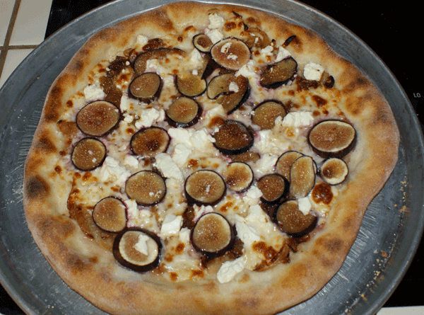 Later on, for dinner, we had two pizzas, the first a routine pepperoni, and the second one was this beauty -- caramelized onions, mozzarella, fresh black mission figs from our tree, and this amazingly tangy Bulgarian feta cheese we got from our local Middle Eastern market. The flour was the imported Pivetti 00 pizzeria flour, of course.