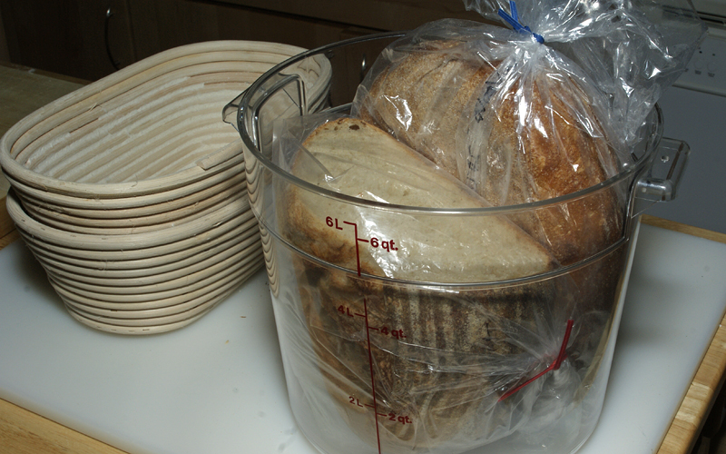 Volume increase from dough to finished bread isn't talked about much on TFL, rather oven-spring is the more common measure. These loaves, exhibited the greatest volume change I've experienced to date. To give some sense of it here is a photograph--minus the "taster slices". The container holding the loaves is that used to ferment the dough. The mixed dough occupied slightly more than 1 liter, approximately 1100 ml (the bottom of the photograph).
