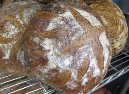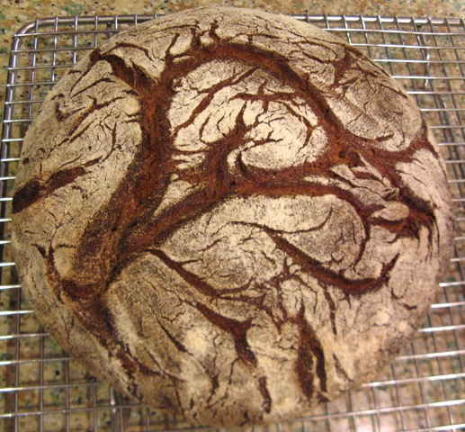 ...a lovely scoring pattern on this loaf, wood-fired and made with freshly milled flour and instruction from Larry Jansen