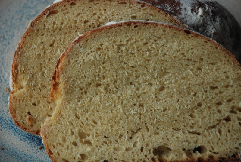 I concluded that I was having dough strength problems and decided to work systematically on that problem. After seeing the SFBI article that I posted about earlier I realized that my thinking had been too simple. Yes, it's true that a weak flour like durum needs more mixing to develop the dough, but I also had to be more careful about other things. For instance, I had been mixing flour, water, and starter in the first mix and then adding salt in the second. While I might be able to get away with that for regular wheat doughs, it wasn't a good idea for baking with 100% durum since the point of autolyse is not only to hydrate the flour, but also to strengthen gluten bonds. I had been using autolyse as a jump start to fermentation so wasn't getting its benefit for dough strengthening. This time I mixed flour and water first, and added starter and salt later. I had been doing a 30 minute slow mix in my Kitchen Aid to develop the dough. This time, I mixed by hand. A spiral mixer might be just the thing for durum based dough but given the importance of mixing for durum dough I thought I could do a more thorough job by hand than with a home mixer. The third change was serendipity. Since I had been making so many attempts at a durum loaf, my durum starter had matured and by now was quite active. While I had known that this was important from a fermentation perspective, I had not realized until reading Didier Rosada's article that it was also important for dough strength since the acids in a mature starter contribute to dough strength. Finally, I decided not to take any chances on having a huge tunnel develop due to explosive ovenspring. This meant that I had to make sure that my dough was not underproofed when it went into the oven, and second I couldn't risk the high temperatures of my WFO. I baked in my gas oven at 420 (instead of the usual 450degF) to slow down oven expansion. With all that, I took another shot at it. For the first time, I got a uniform crumb with absolutely no tunnels. And so concludes lesson 44 in breadmaking - Introduction to Dough Strength.