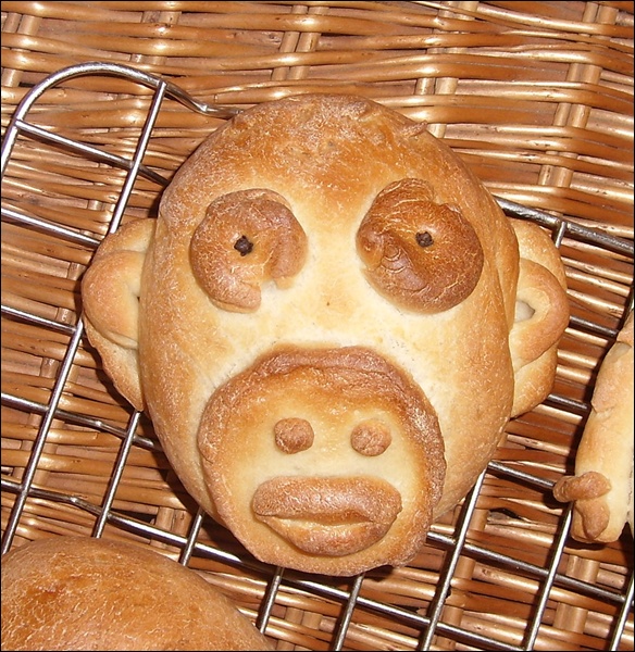 Does your family have nightmares about the monkey coming back to life, after they've eaten him?   What a fun gallery of animal breads!  -Varda