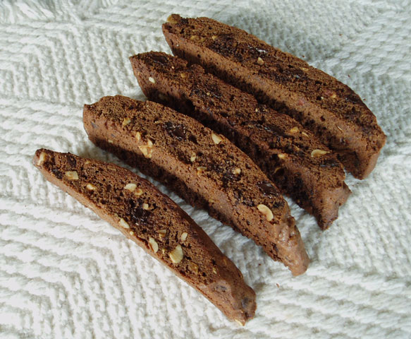 A couple of days ago David G. posted this recipe in his blog here.  Being a chocoholic that refuses recovery or treatment, I could/would not resist the temptation to indulge.  First, though, I must point out in my defense that I have never baked a biscotti before.  Ever.  They came out well enough to rapidly become an endangered item in the kitchen though!