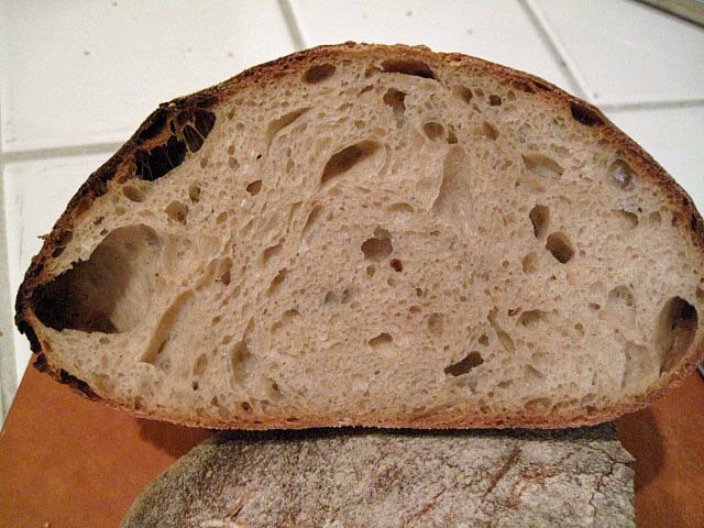 This time, I did not retard the loaves overnight. I don't recall if I've done this before, but I really enjoyed the result. Tasted two hours out of the oven, still a little warm, the flavor was spectacular. It was very mildly sour with a sweet, complex wheaty flavor. Either with or without retardation, this is a delicious bread.