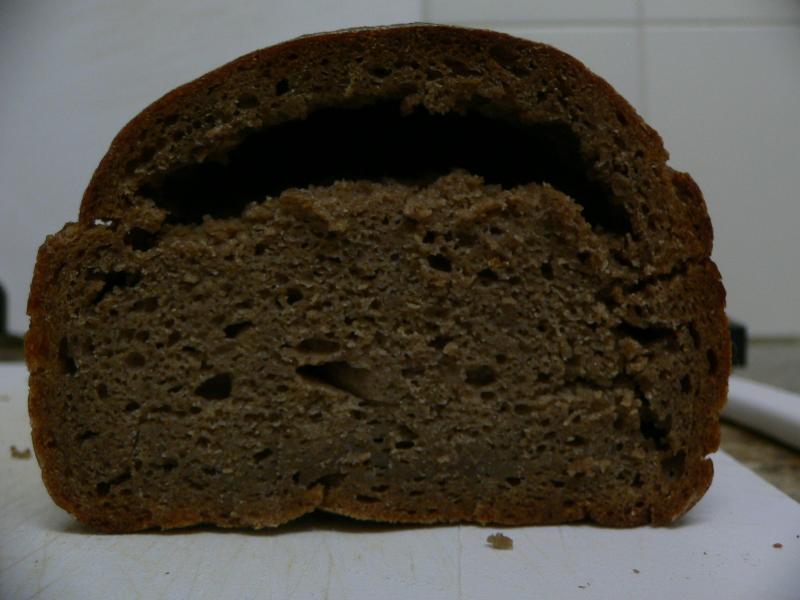 Prepare a 4.5x8.5 inch loaf pan (I use some non-stick spray, which works well). Mix together the rye flour and salt, and spread over the starter to protect it from the hot water. Pour the hot water on top, and immediately mix all ingredients well with a wooden spoon. You will get a nice, warm, dough. Shape the dough into a loaf and place in the pan. The dough is quite clay-like and sticky, and there's no gluten to speak of, so I just use wet hands to make a loaf shape. Prove for 2 hours. 30 minutes before baking, preheat the oven to its highest temperature (250C, approx. 475 F, preferably). Place an old pan at the bottom of the oven to create steam. Place loaf in the oven on the middle shelf (Hadjiandreou doesn't call for docking/slashing it), pour a cup of hot water in the pan at the bottom of the oven. Close the oven door, reduce the heat to 220C/425F and bake for 45 minutes. Remove from oven and cool. (The original recipe is for a 4x6 inch loaf, which bakes for 30 minutes. Reasonably, the baking time for a larger loaf would be longer, too). I have made this bread twice already. The first time I did the "1.5" version above. The second time, I did the smaller loaf, but baked it in a 4x8 inch loaf pan. I have encountered several problems with my bake: 1. The bread wasn't even close to done at the end of the baking time. The top of the bread might have been brown, but when I touched the bottom of the loaf, it felt soft and not hard at all. I ended up baking the loaves for far longer (>2 hours). The first time I baked at a high temperature for a long time, which caused the corners of the loaf to burn. (The remainder was okay and quite edible). The second time I baked differently: I reduced the temperature to 180C/350F after about 15 minutes, and baked for a long time at this temperature. I also left the loaf in the turned-off oven overnight. 2. Even after the long baking times, the crumb of the bread was quite gummy and wettish (after having waited 48 hours to slice the loaf). Moreover, the bottom of the bread was gummier than most of the bread. (It had a 1 cm line of bread that looked much gummier). 3. The bread exhibited the "flying crust" phenomenon, where there was a big, gaping, between most of the loaf and the top crust. (Thinking that I might not be introducing enough acidity into the dough, in the second attempt I also added a tablespoon of vinegar to the dough. It didn't help.)Crumb picture:  All that said, the flavor of the bread was very good. I would like to know what I can do to solve my baking problems. I don't know why the bread is taking so long to bake, nor do I know how to avoid the flying crust. I do measure the ingredients out very carefully, and follow the steps diligently. Any help from rye-baking experts will be appreciated!