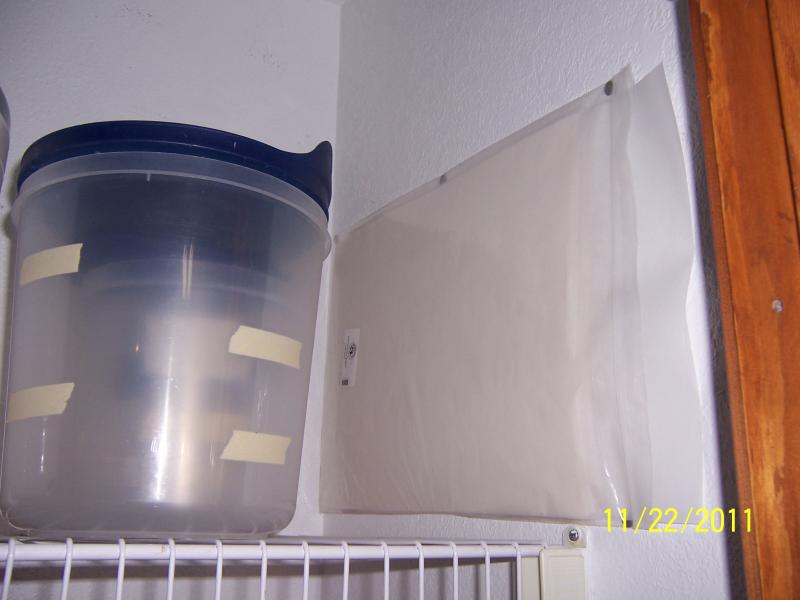 For those casual bakers like myself who have a new sack of half-sheet parchment papers from King Arthur Flour (or any other source with a similar package), I found a place to store my new papers in the pantry without fear of them falling through the slots between the wire shelf units or getting wrinkled or dogeared. I simply used flat head thumbtacks (not push pins) on the inside of the bag to stick them to the wall as shown above. VOILA! Carefree storage.