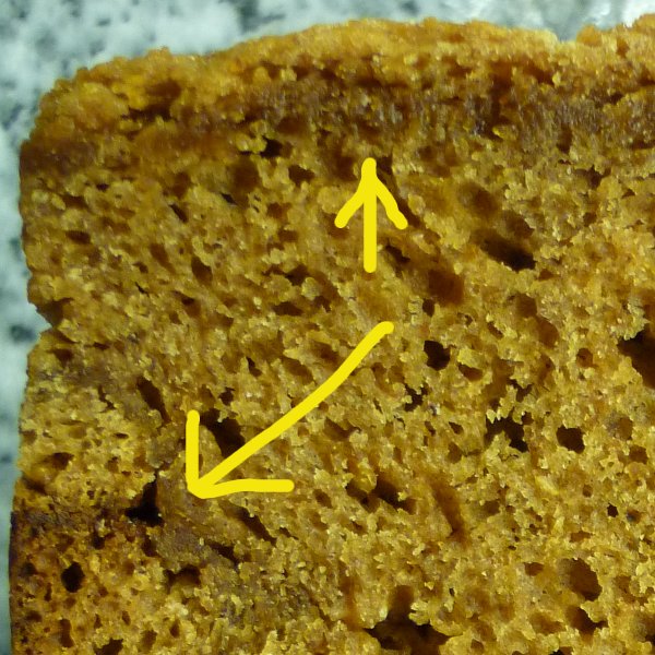 Interesting that this bake exhibited the gummy layer near all the surfaces with air contact. The yellow arrow in the following picture shows the position of the loaf tin edge: