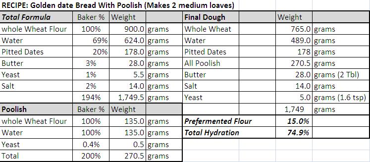 As i browsed through Laurel's Cookbook for Wholegrain Breads, i came across a recipe that utilizes Dates! and i live in a region where Dates in most forms are abundant all year round. The recipe calls for Pitted dates, that must be simmered first, and the resultant cooled goo is to be added to the dough. I had some date paste (used for confectionary, and pastry), and used it instead, so its not technically Golden Date Bread. I also added poolish to the recipe, and adjusted the formula accordingly. This bread, is a 100% Whole Wheat enriched bread, that is leavened by commercial yeast.