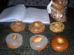 Just this week made a dozen bagels from ITJB (pp. 98-100). I used malt powder in the dough (bought it from NY Bakers, as well as the high-gluten flour--All Trumps). The recipe told me that the powder is best mixed with the water, and I put about 2 TBS of barley malt syrup in the boiling water (as in the recipe). I followed the recipe closely; only exception (Hamelman tip) is that I put the bagels in a bowl of ice water after the boil, then put them on a towel-topped cooling rack, then dipped into a tray of seeds. I did a bulk fermentation before shaping of about 40 minutes (Hamelman--again--says an hour; ITJB says 20 minutes--so I compromised). They were refrigerated overnight after shaping (the old-fashioned way, but I had to scale them--3 oz--novice that I am). They were made as a "straight" dough, the flavor being developed through the overnight retardation. I left a couple plain, topped the rest with a variety of seeds, sesame, poppy, multi-seeded (sesame, B & W, poppy, flax, fennel and, my favorite, sunflower, mixed with some onion powder a little fresh-ground sea salt). I found the size to be just right (I previously had made 4-oz bagels, which really are more than I ever eat--I usually eat just a half of those). They freeze beautifully, and they are the real New York style water bagel. My late Uncle Leo was a bagel baker in Brooklyn (never found out if he was in the union--better ask my cousin), and I know a good bagel when I sink my teeth into one. These are the real deal. (My husband, who lived on the Lower East Side as a youngster, is in bagel heaven.) Here they are, half on the way to being bagged and frozen--uncut.
