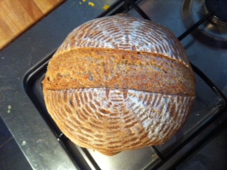Hi Everyone! I have tried two times to make a sprouted wheat sourdough boule, and both have tasted lovely and looked amazing, but unfortunately were very very wet, despite using all my usual techniques, times and temperatures. I can only assume that the ground sprouted wheat flour must hold more moisture and need a much longer baking time? The first time I was taking the loaf with me out of the house so couldn't put it back in the oven, but the second time I cut it, discovered it was too wet still (after cooling period of course), so popped it back in the oven for awhile. That helped, but overall the result was still much too moist and just generally very weak structure once I started to cut it. I realize a loaf that isn't fully baked will have this problem, so I am hoping that giving a much longer baking time at slightly lower temps will sort out both issues. Just wondering, does anyone else bake with sprouted, ground flour? (I sprout the wheat berries myself over about 3 days, dry out and grind). Thanks in advance for any replies. :) Pic of second boule below...