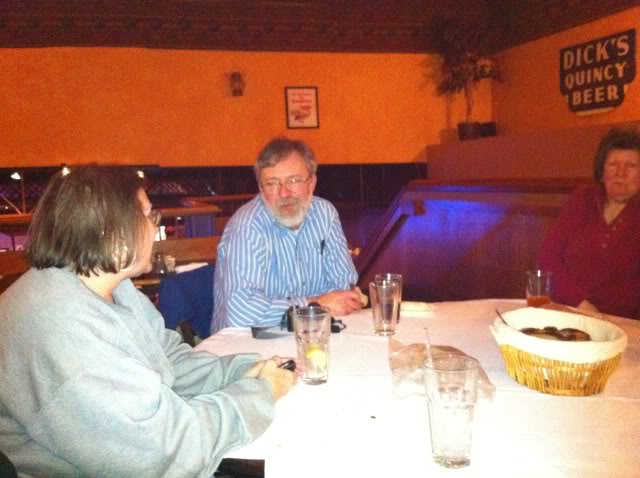 In the first photo, SuzyR to the left and theuneditedfoodie on the right with his wife in the center.  In the second photo, FuzzyWhiskers on the left, Postal Grunt in the center and his wife on the right.  I'll let them out their real names if they wish.