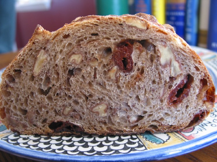 While browsing through my future bake folder I found a formula for Cherry Pecan au Levain from mountaindog. I've made this type of bread before but this formula caught my eye and it was time to try it out. Minor modifications to his formula were; 50g spelt substituted for 50g of the whole wheat, added 3 Tbs toasted wheat germ and 1 tsp diastatic malt, used a 50/50 mix of King Arthur bread flour and Honeyville Alta Artisan Unbleached All Purpose. The whole wheat, rye and spelt were fresh ground. My starter formula is borrowed from David Snyder; 70% AP, 20% whole wheat and 10% rye. The shaped loaves were retarded at 48*F for 15 hours in my basement cold room.