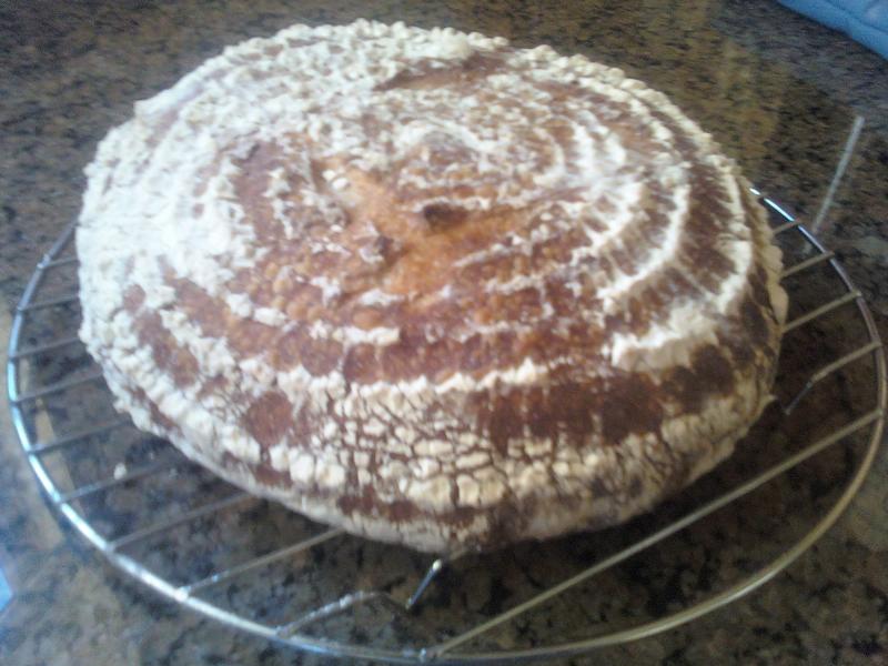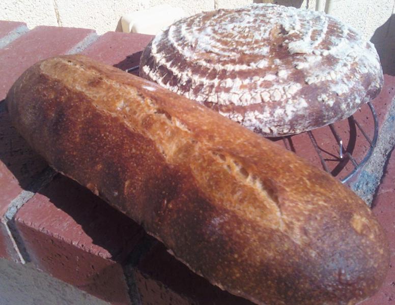 David's small SFSD boule went into a heavily flowered basket that should have been floured more sanely.  I used 50% rice flour for this heavy handed dusting.  I have never done this before so, was flying a little blind and had read that they will stick when the basket is new.  Plus this basket was never meant for bread in the first place.  When I went to slash David's boule, it was pretty hard and my razor just sort of bounced off.  I finally butchered it with a big serated knife.  My slashing skills are quite primitive and weak to begin with even though I have seen many folks live, and on video doing it like it was easy as pie.  I think they are showing off knowing my slash challenged bread making skill :-)  David's didn't spring because of its tougher exterior and Nury's nearly exploded.  Both browned up nicely and I did bake the boule 5 minutes longer to get that deep dark skin.