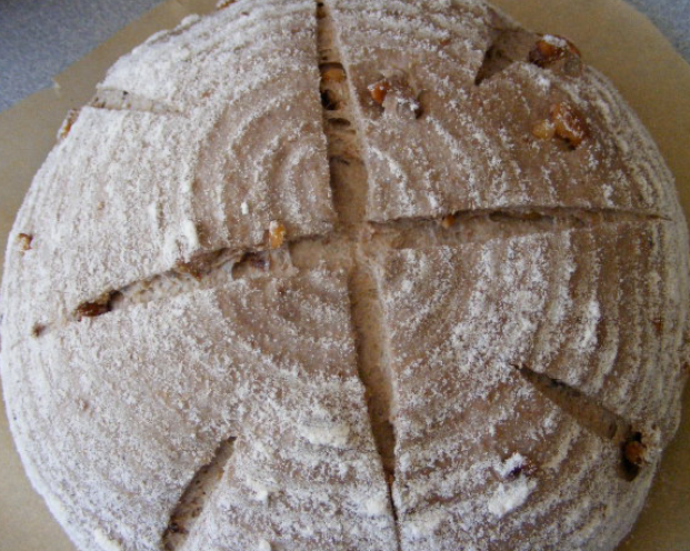 - Add desem starter to autolyse then knead (French fold) 5 mins. Return the dough to a bowl and add salt and remaining 50 grams of water and squeeze through bread to incorporate (dough will separate then come back together smoothly) then knead a further 10 mins. Add Walnut paste, roasted walnuts and chopped sage leaves and squeeze through dough until combined.