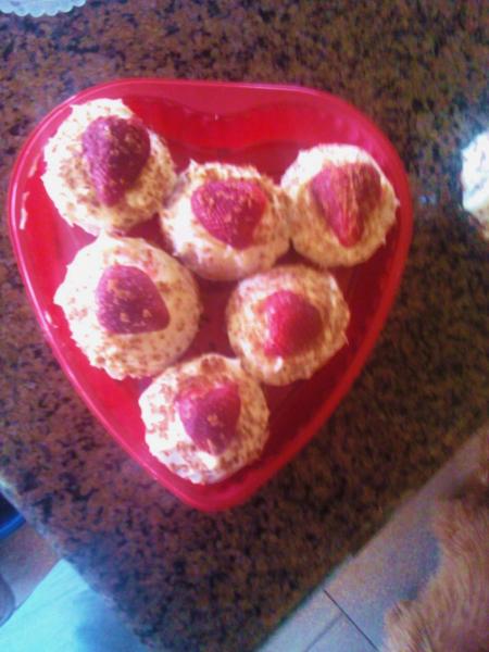 I take my standard Banana Nut Bread recipe and add, bourbon soaked dried fruits (cranberry, sultana,raisin, apricot) and chocolate chips. The cupcake is topped with cream cheese icing, shaved chocolate and a half a strawberry in the shape of a heart.