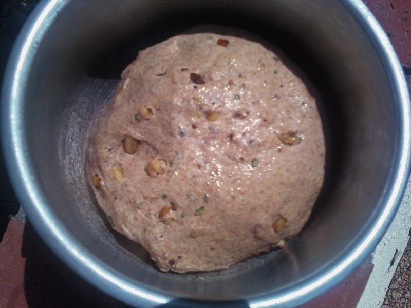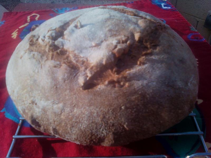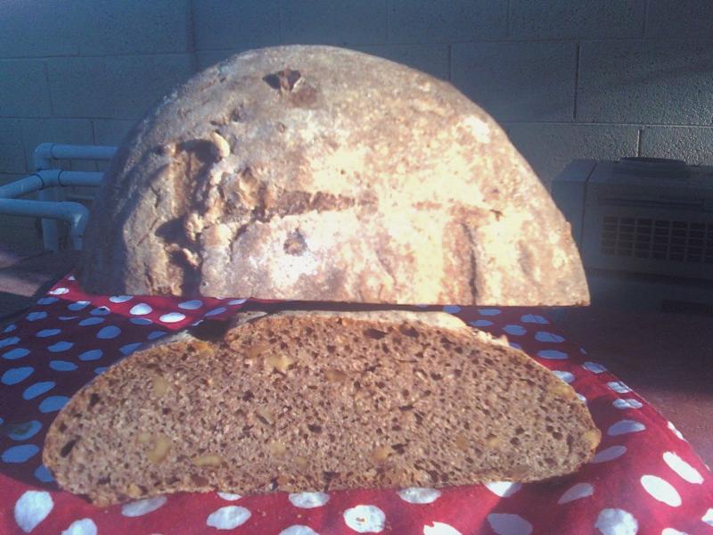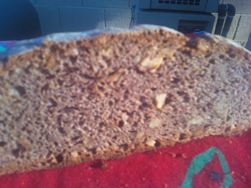 The brown bag containment field worked overnight I am pleased to say and once under the bread knife, it was purple after all!!! The cell phone camera just doesn't do it justice. This is one handsome round of bread and the smell is unique but nice as well. Even when using the home ground whole meal wheat berries, the crumb is not dense, but slightly open, soft and moist too. The home grown sage comes through well and the walnuts, which I thought would be too many and too much, are also very tasty and in balance. What a great concoction Phil has pulled from his Hulking bag of tricks! Have had it plain, toasted and with goat cheese this morning and it just grows on you subtely. Before you know it - its nearly gone - but I did freeze half of it. I cut your formula in half and got a small round. It didn't spring as much as I thought it would in the cast iron enameled pot I used but I think the pot was too big and I should have used a smaller one. It did rise well in the basket during final proof. I did let it go 1 and 3/4 hours instead of the 1 hour in Phils formula until it passed the poke test. This is a sophisticated, fined and elegant yet rustic kind of bread that is in a new class - the purple one.....a bread that people want to eat. Very nice indeed Phil.