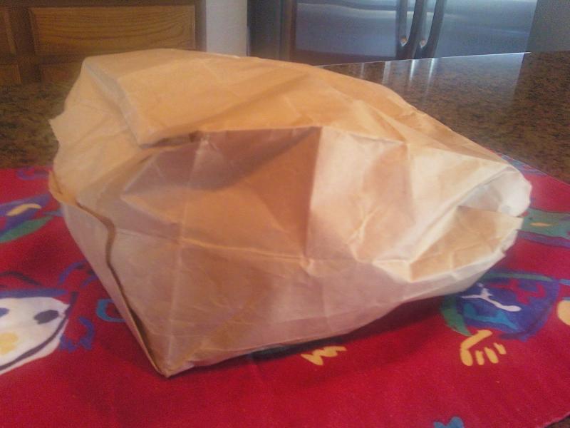 I didn't want to cut into it. Not then. I thought that there might be something purple or green or both inside. It could easily have been a purple people eater or even something much, much worse. I had to wait until the morning light - didn't want to be crippled by darkness if it was something horrible ........and emerged very hungry. I would have needed every advantage to escape if it had attacked. I contained it in a brown paper bag so it stayed nice and comfy, unperturbed...... and had no reason to attack anyone ......until it was too late......and the bread knife struck when it was least expected. Sleep well my friends in bread. We dealt with this purple menace on the morrow. We lived through the night.
