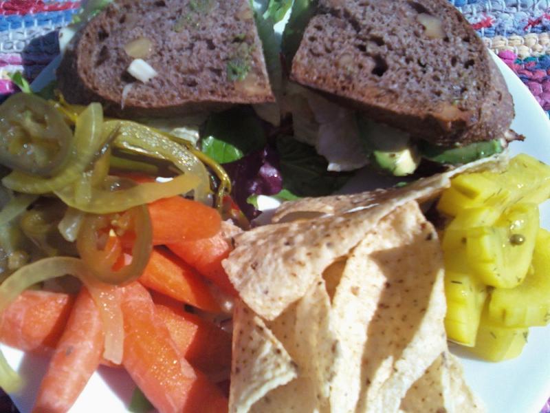 Just to make you wish you had some more here is how I had it for lunch today. Dijon mustard, stuffed grilled chicken supreeze - sliced thin, ancient white cheddar, lettuce, tomato and, of course, sliced avocado. Chips, picked; peppers, onions and cucumbers and nice fresh carrots round out a fine lunch inspired by some of the best bread on any planet.