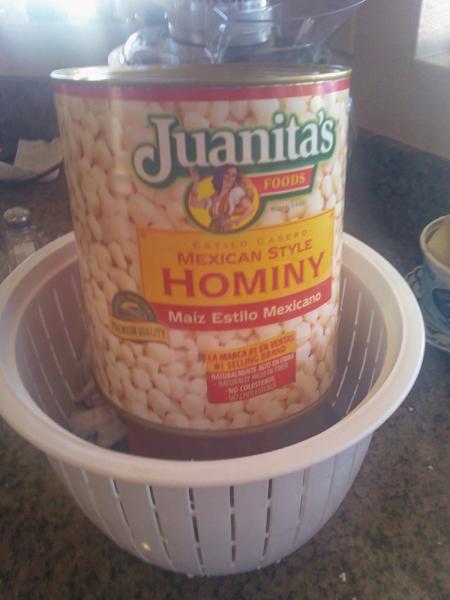 of HOMINY! I can't get it here anymore, used to get it at Safeway, but no longer, (well its a long way up here from the southern states where hominy rules) and so far I haven't found a decent supplier of field or flint corn to make my own! And yes I can do that! My mother used to grow corn and make her own for years, but its not easy to get the right kind of corn with a short enough season to grow in northern BC, and her corn seed eventually died out on us. But she grew up on hominy, and I love it, but you simply cannot make it from sweet corn, and pop corn is ok, but its not really easy to make from that either! I just wish I could find those can's here! By the way the hominy process frees up the protein from the corn and makes it better for you. You can starve to death and wind up with pellagra eating plain old corn, or cornmeal products!