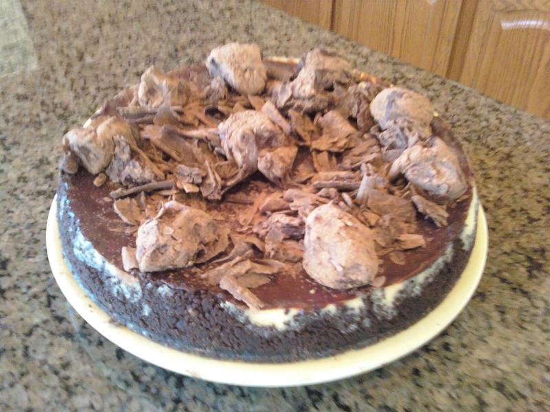 Today is my wife's birthday. Who wouldn't want a chocolate crusted orange flavored cheese cake with an orange flavored; chocolate ganache, truffles and chocolate shavings for toppings? Home made aranchello makes this a special birthday cake.