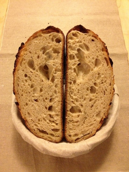 I've only made the country bread once -- I purchased the Tartine Bread book on Thursday evening, did the bulk rise on Friday from 6 - 10 pm, then shapped, and then retarded the final fermentation until this morning at about 6 am, when I let them warm for an hour, and finally baked. I have to say, I was very very skeptical about the stretch and fold technique, since I'm still an inexperienced bread baker, but wow! one of my best crumbs yet. One thing I did though, since I live in a 100 year old house with terrible insulation that is always cold in the winter, I heated up my pizza stone in the oven and then turned the oven, letting it cool to about 90 F. Then I did the bulk rise in the 90 F oven, in a stainless steel bowl, covered with a towel to prevent any direct heat. It seemed to help. Anyway, aside from my ill-executed lame scores, my batard turned out pretty much the same as the one in the book - amazing consistant large holes, nothing too irregular or too dense, and delicatly sour taste. Anyway, perhaps its worth a try to bulk rise a bit warmer...