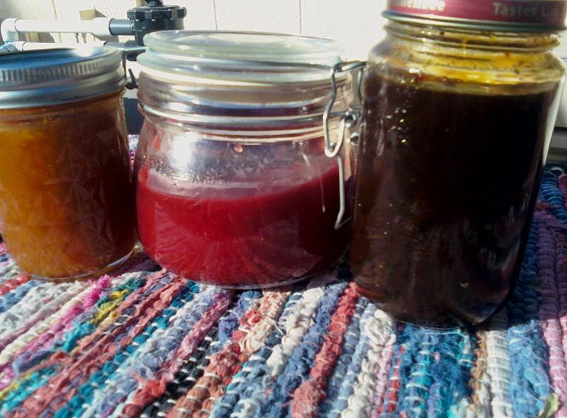 to be easy for me to do something.  Luckily there are very few things in this world that are difficult.  I found myself running low on jam.  I had a dragon fruit /prickly pear cactus tuna jam and a lemon Serrano pepper jam and that was it.  It's not like me to be so low on varieties of jam.  It is also citrus season and I had just made a couple of gallons of limoncello and aranchello, froze a couple gallons of juice from that and it also means it is marmalade time.  I made several jars of regular minneole marmalade and the fabulous caramelized variety (a recipe I invented by accident) and I put up some strawberry/ ginger/apple while I was at it.  here is a pix that shows the regular marmalade on the left and the caramelized on on the right.  The recipe is simple enough.