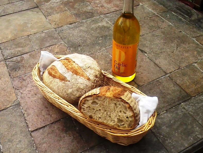 cut the loaf while still warm and found we were out of butter.  She reached for the garlic oil and I grabbed some herbs.  She was shocked.  What are you doing?! After tasting, she added more herbs and oil. Now she's hooked.