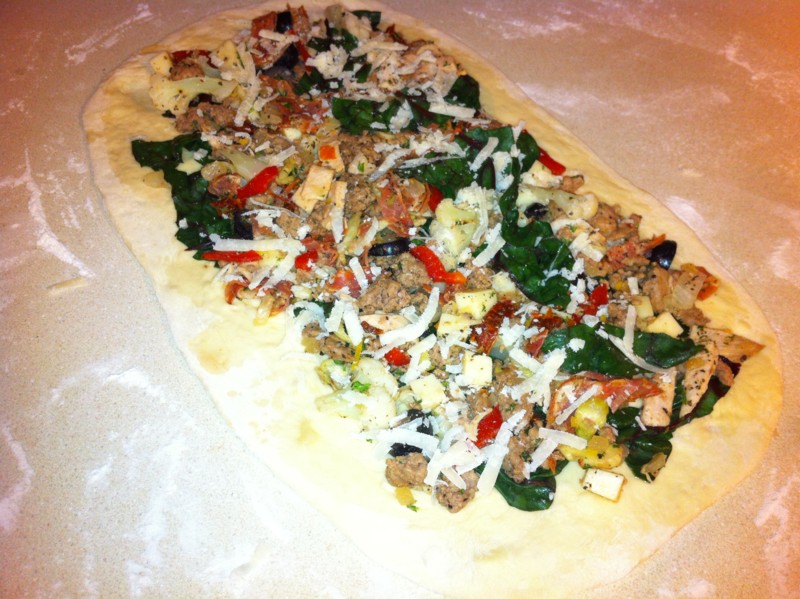 I know this is a bread forum... but I do a similar dish to this but use a flank steak instead of bread dough, then tie the thing up and then slow cook it on very low heat on the grill for about 5 hours. The flank steak turns out so tender after being slow cooked for so many hours. Its called Matambre or "Hunger Killer"