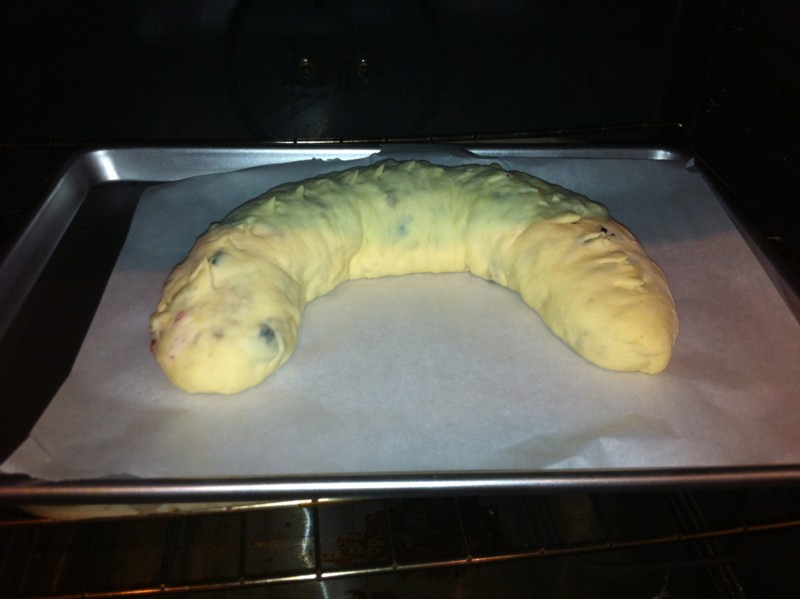 Once rolled, ensure that the seam and ends of the roll are tightly sealed so that the filling wont leak out during baking, transfer to a paper lined cookie sheet, seam side down, and brush with olive oil. Gently bend the roll in a wide curve or crescent, the crescent shape being an important symbol in Saracen culture. While Middione doesn't mention this in his recipe, I took some scissors and snipped small steam vents along the length of the roll to keep the roll from getting soggy during baking.