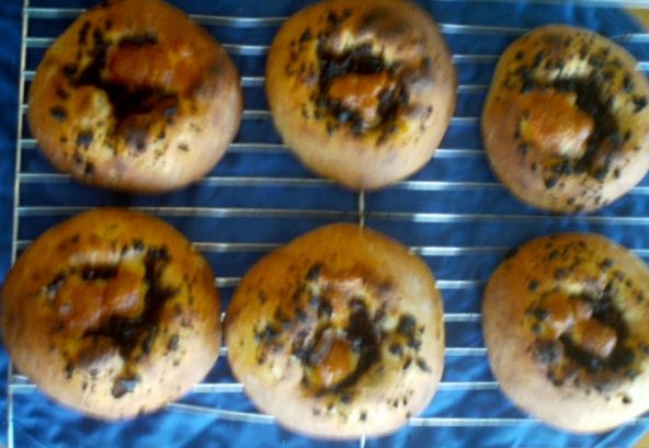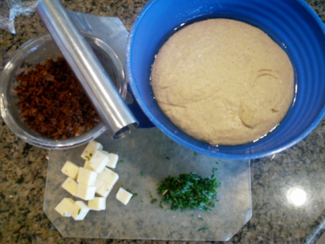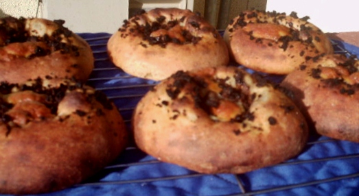 Yeast Water, Rye, WW, Garlic Chive, Onion, Cheese and Chorizo Bialy’s