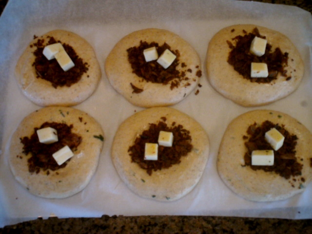 Use back of wetted spoon to depress the middle of the dough disk to ¼” thick and dock the depression with a fork to persuade it not to rise. Place 1 -2 T of onion and chorizo mix in the depression and cover with 2 cubes of pepper jack cheese.
