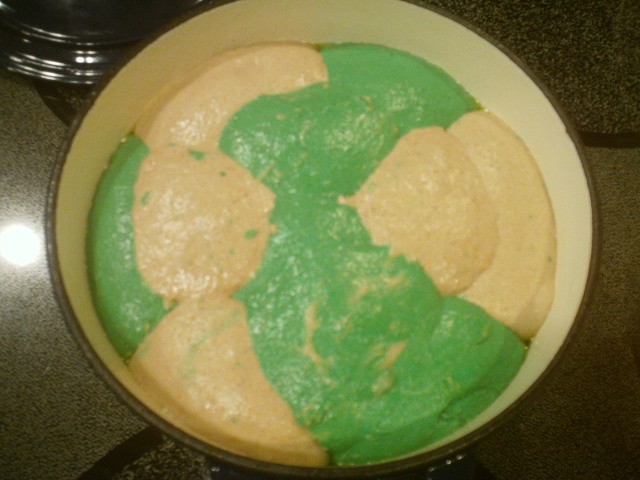 3. The dough should have a medium consistency and pass window pane. Divide in half and place ½ in an oiled bowl and cover. Add green food coloring (about ½ tsp) to the remaining half and mix with dough hook on speed 3 until incorporated. Move green dough to an oiled bowl and cover.