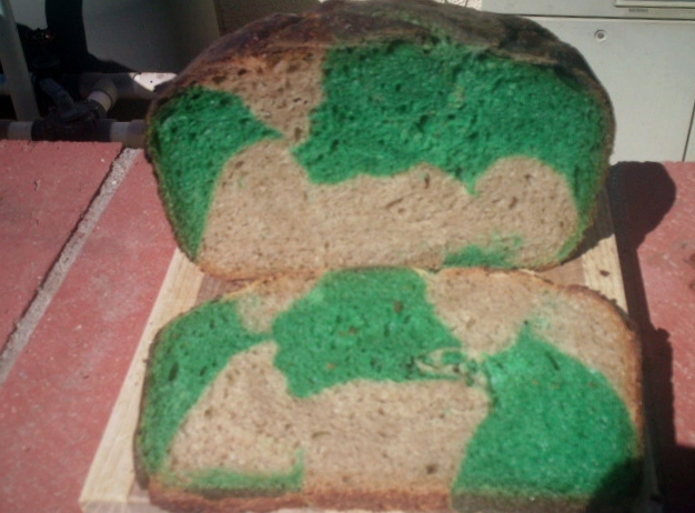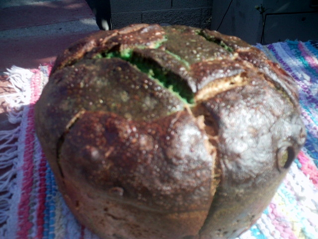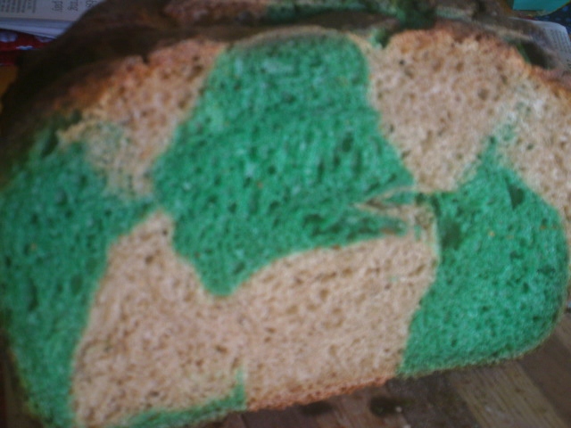 For St Paddy's day I decided to not do a croissant bread or one shaped into an Irish Harp but one that was sort of shaped into a soccer ball (the national sport of Ireland by far) with alternating green and a white-ish patches. Plus it had to have a bottle of Guinness as well along with 10% WW and Rye for a well rounded flavor. I won't have crumb shots till tomorrow but the crust turned out a deep brown with cracks, just like the last DO SD bread managed to exhibit. The spring was about 3" or about 75%. It started 1" blow the rim of the DO when it went in the oven and ended up 2 inches above it. It is a fine looking loaf. Here are some pix's and the recipe follows them. Couldn't wait - here are some crumb shots.